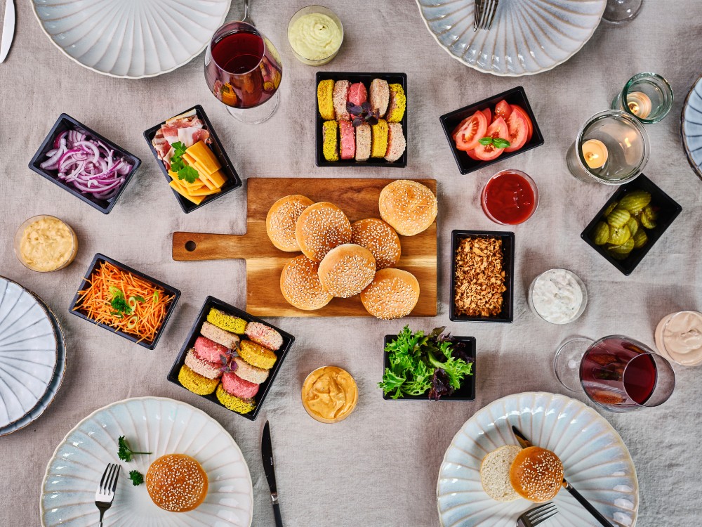 Vijf verschillende burgers, verschillende garnituren, groentjes, sausjes en bijpassende broodjes
