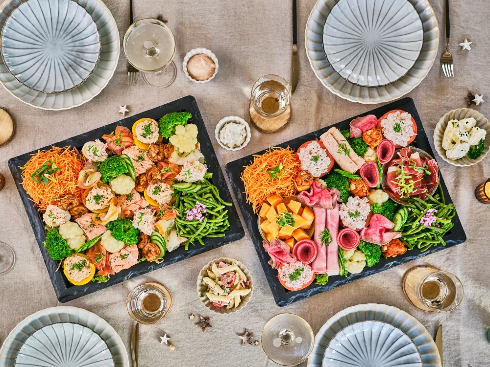 Cavaillon met parmaham, natuurham, salami, kippenboutjes, rosbief, kippenwit, gerookte zalm, gekookte zalm, scampi, perzik met tonijn, tomaat garnaal, ei met krab, koude pasta, groentjes en sausjes (afhankelijk van het aanbod)